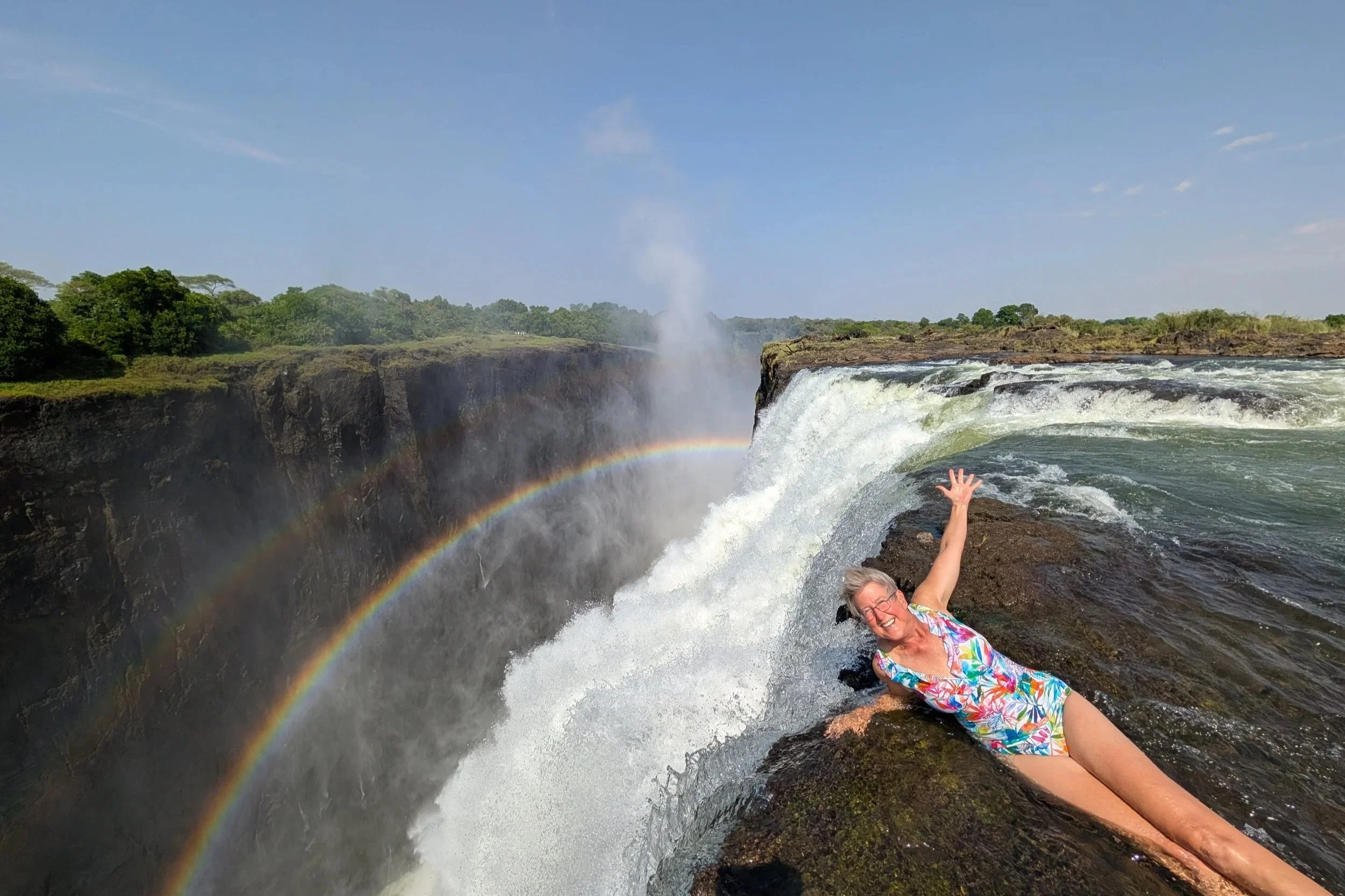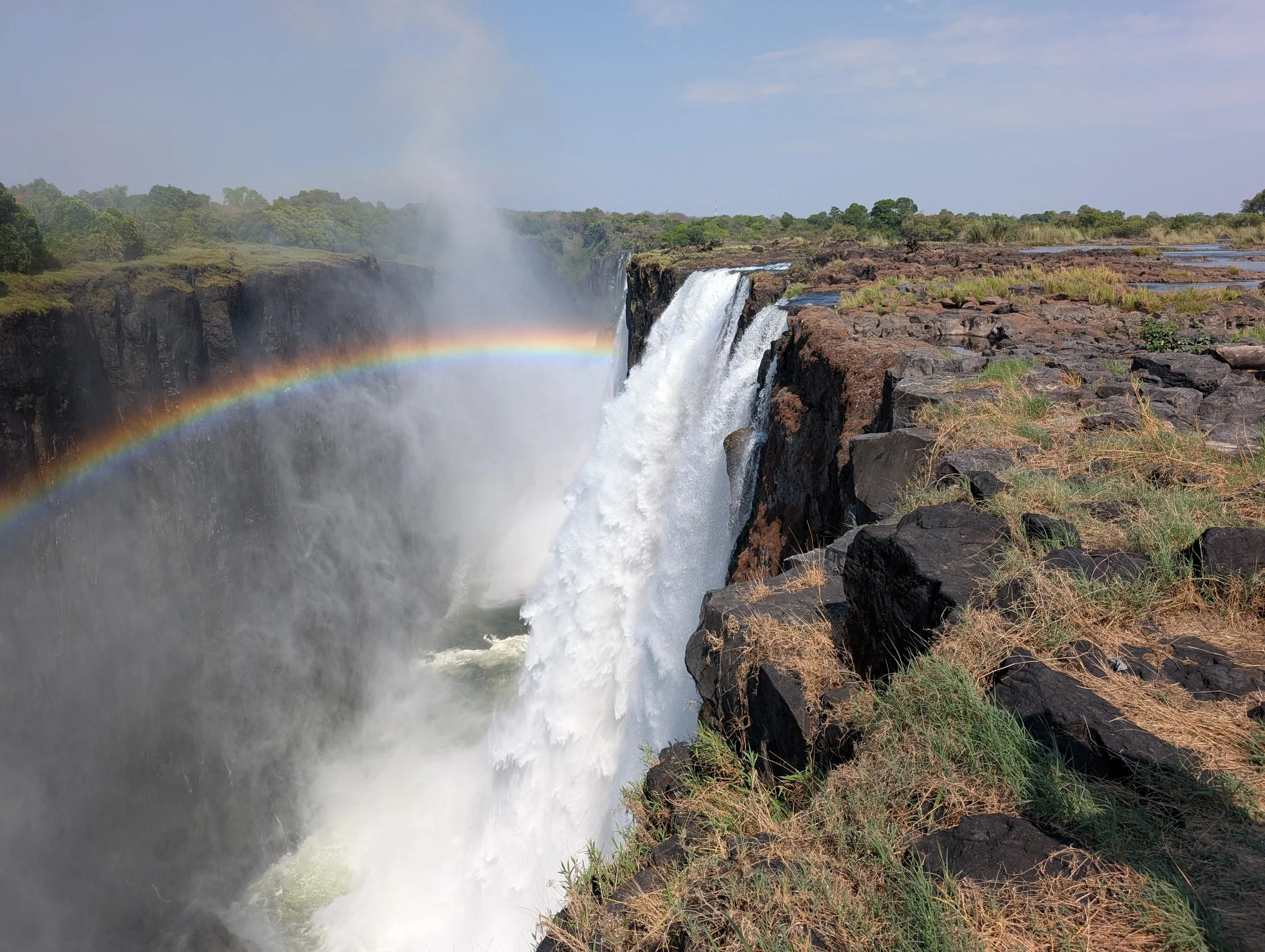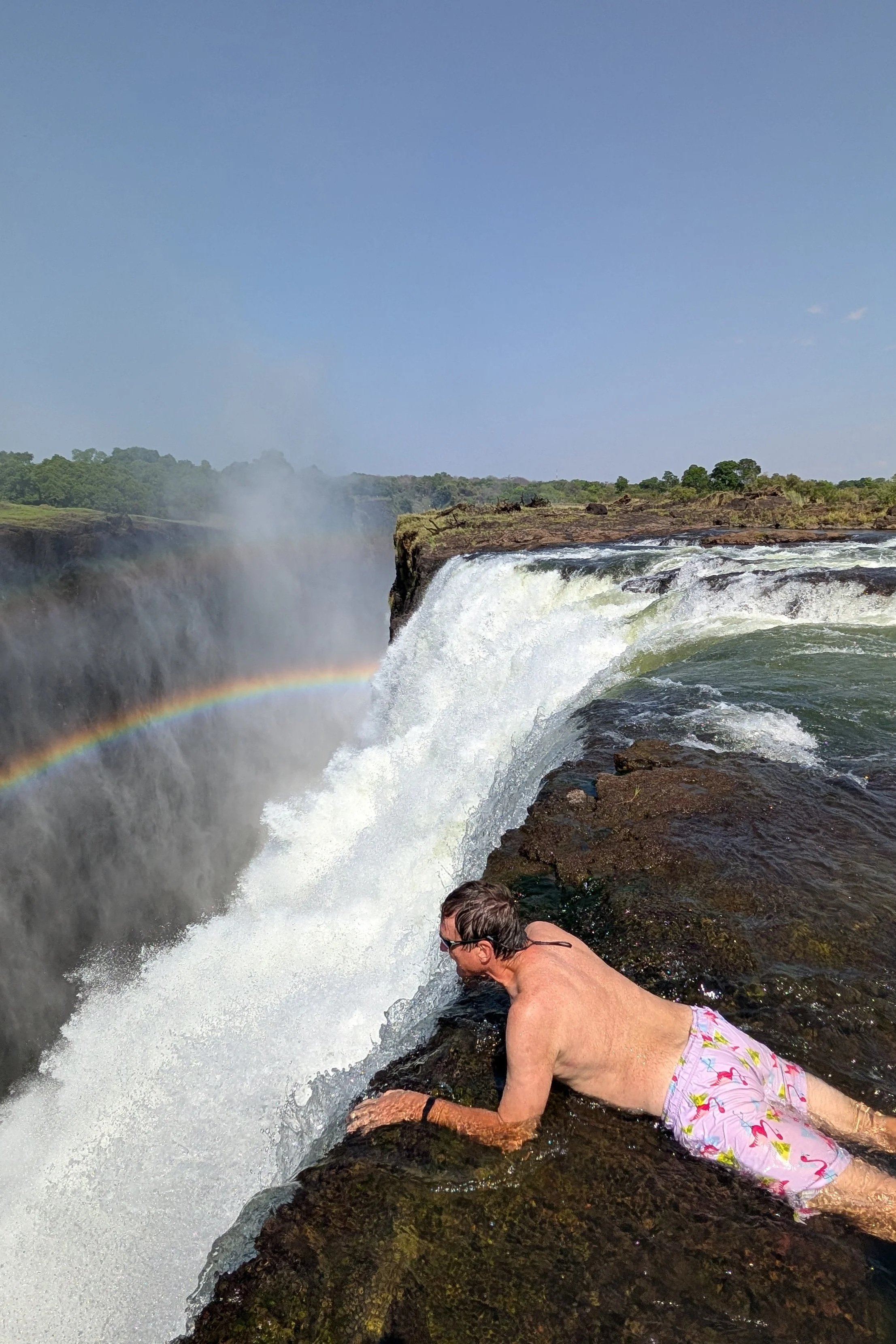 The mist in the distance is the edge of the falls we’re racing to! We went over to Zambia, so we could take a dip in the Devil’s Pool. We walked across those rocks at the right of the next picture to get in the river between that closest waterfall and the bigger one next to it -