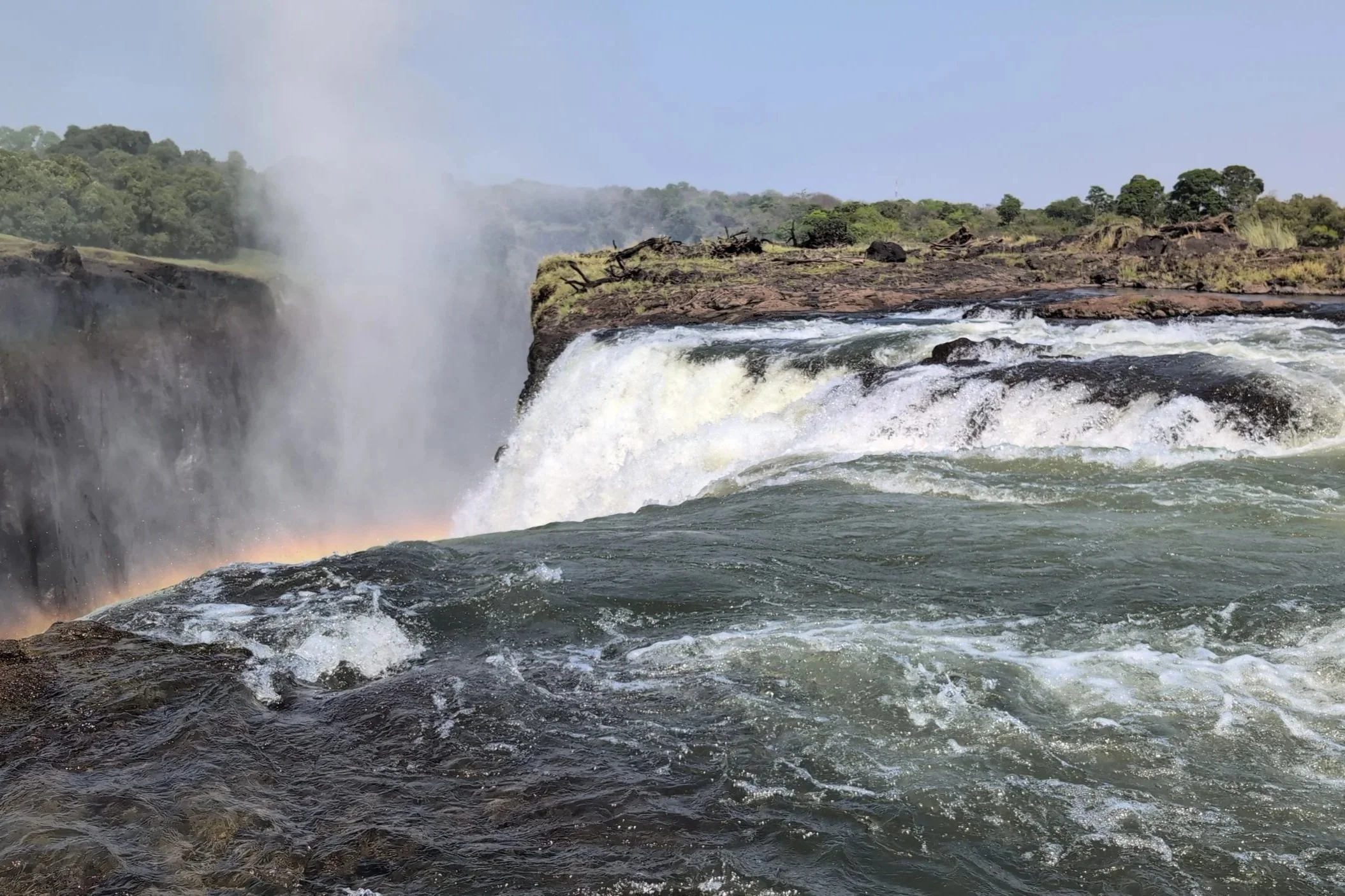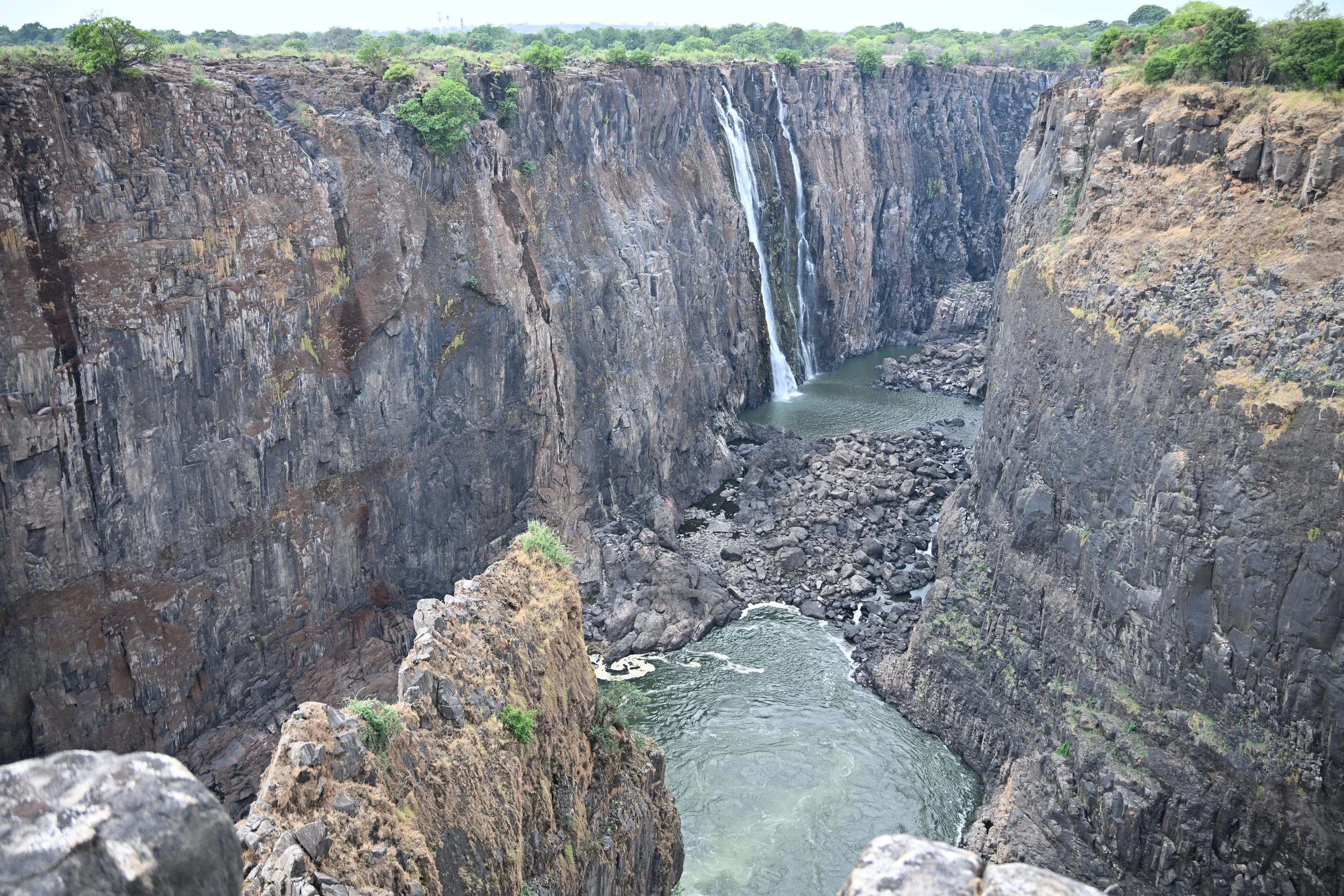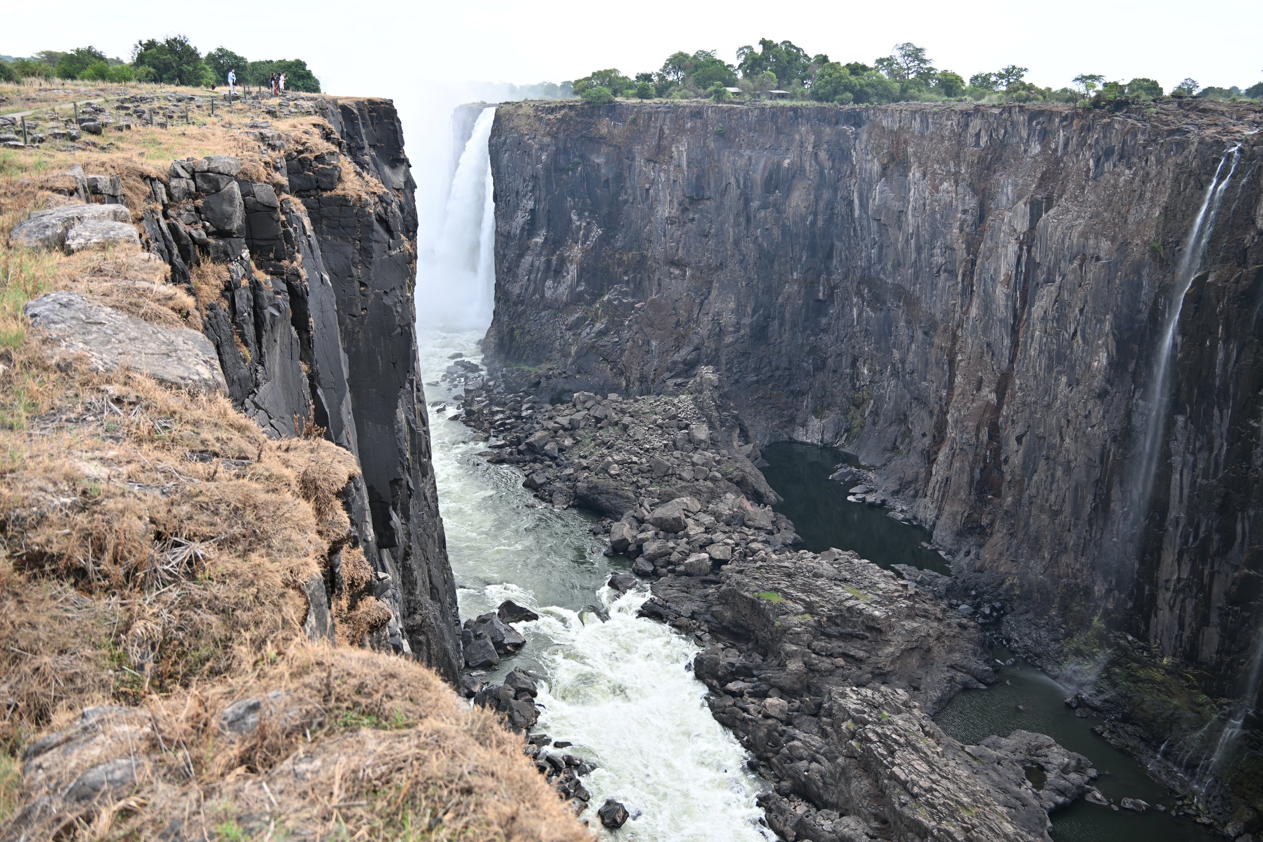 The picture above is showing the Zambia end of the falls. At high flow, that entire wall is covered with falls. The next picture shows where Horseshoe Falls would be (along the right wall where it bows away from the river) -