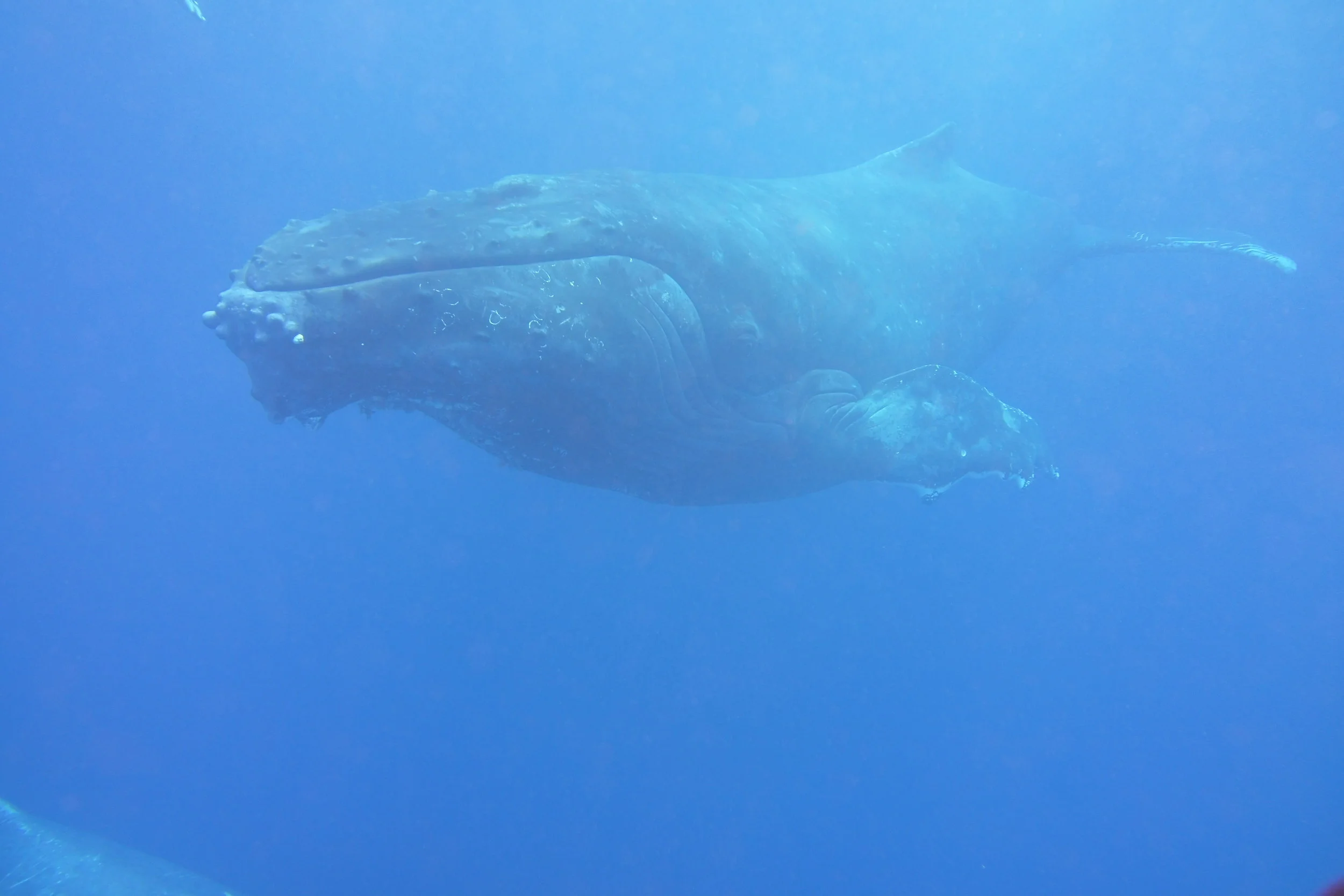 The next day, after leaving these 3 beauties, we met up with a (probable) "adolescent" who had lots of energy and was definitely showing off for us. Interestingly, he had completely white pectoral fins, which is new and unusual for Tonga. Typically, the Tongan humpback population has dark coloring on the tops and white underneath, while humpbacks in other parts of the world are white on both sides. (hmmm... who's your daddy?)
