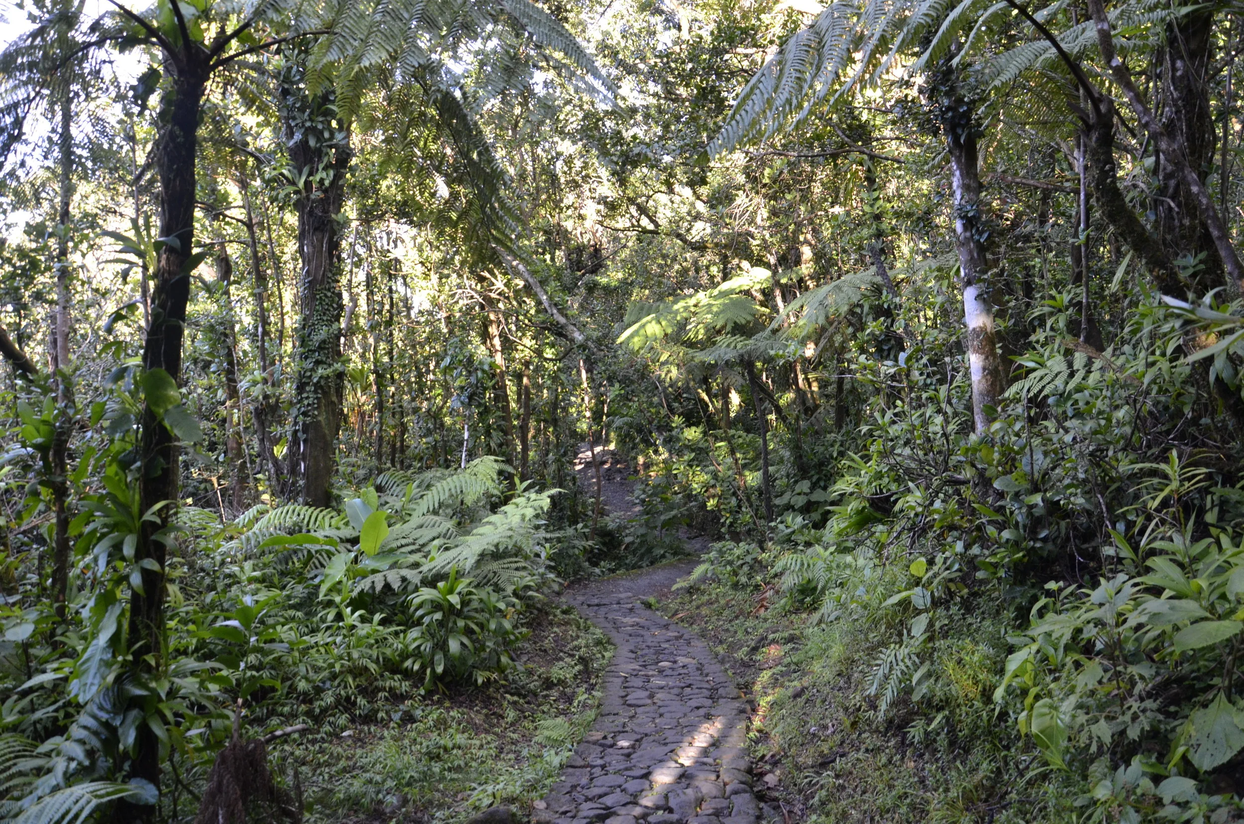 We quickly set out and got to the parking area by 0800, which was such a blessing, as we got a spot right near the trailhead, rather than having to walk a half mile or more uphill, even before beginning the formal trail. It was “only” 2 miles of hiking up, but we gained 2200 ft over that distance, topping out at 1467 m (4,813 ft). We started in the rainforest:
