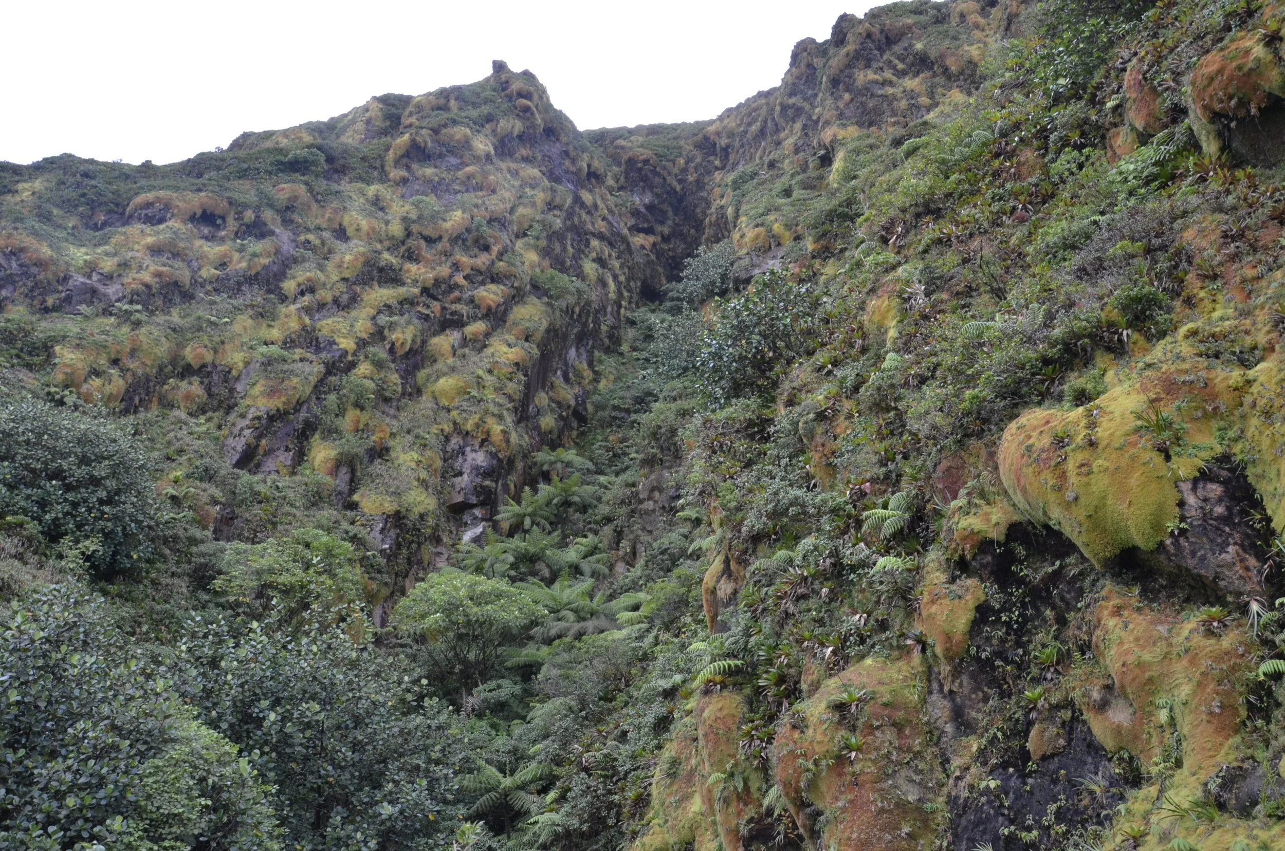 There was a large rift near the top that has been filled in over the years with mature palm trees (giving you the scale of the cleft) -
