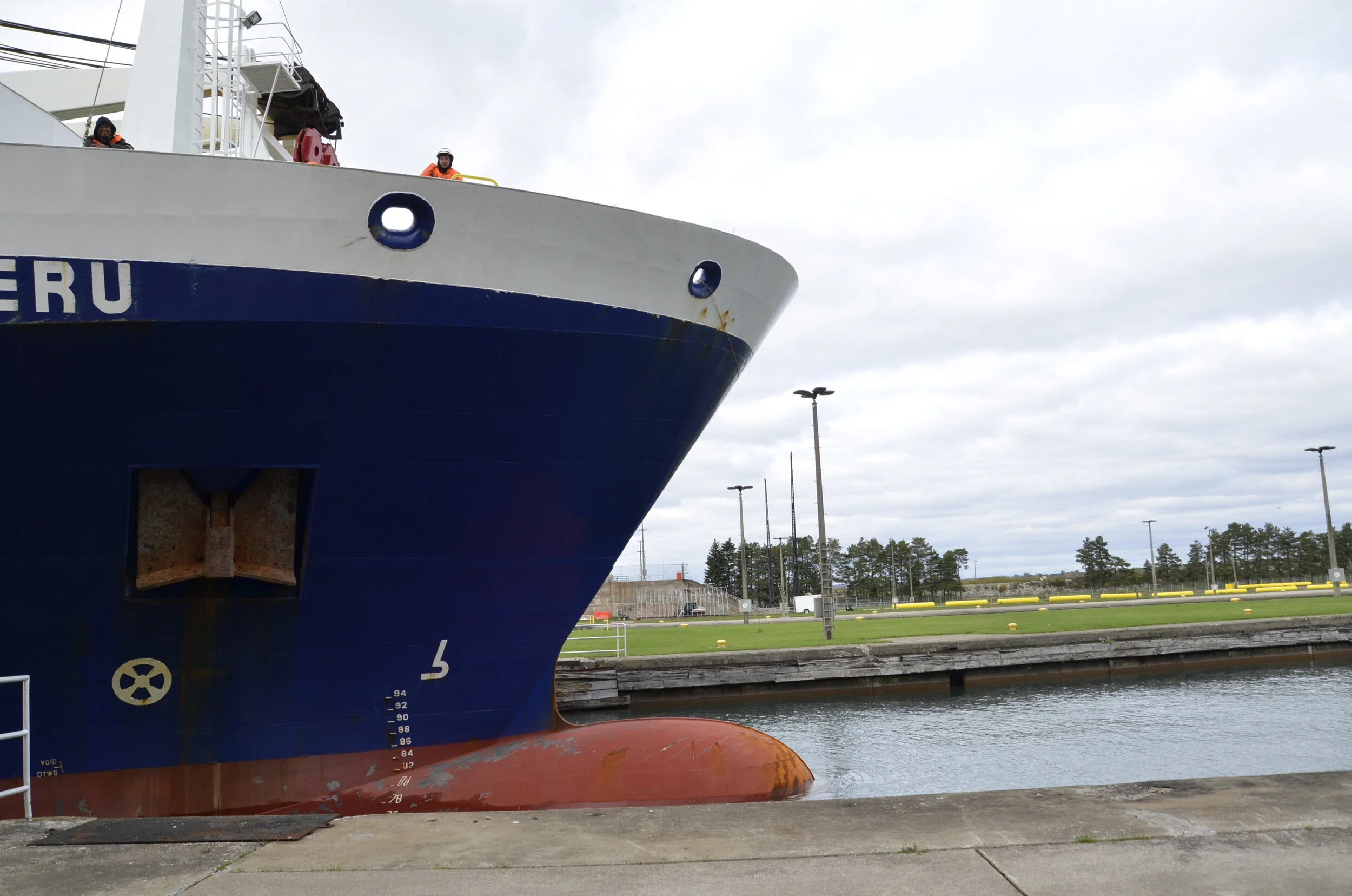 …we were curious about how locks work, so ended up in Sault Ste. Marie. The Soo Locks, as they’re locally known, have been used since 1855. They bypass the rapids of the St. Marys River between the Great Lakes of Superior and Huron. Obviously locks built in 1855 couldn’t handle the enormous ships of today, but the engineering idea is the same. They work by gravity.