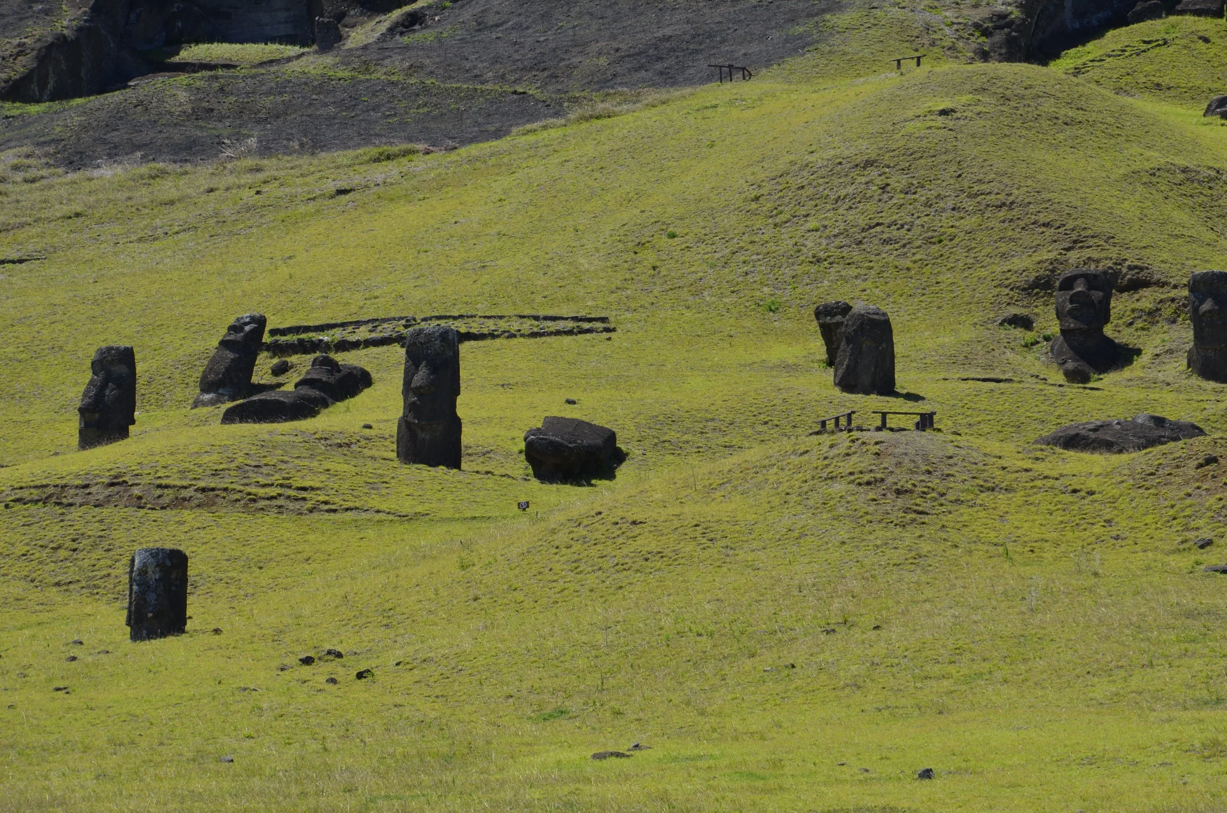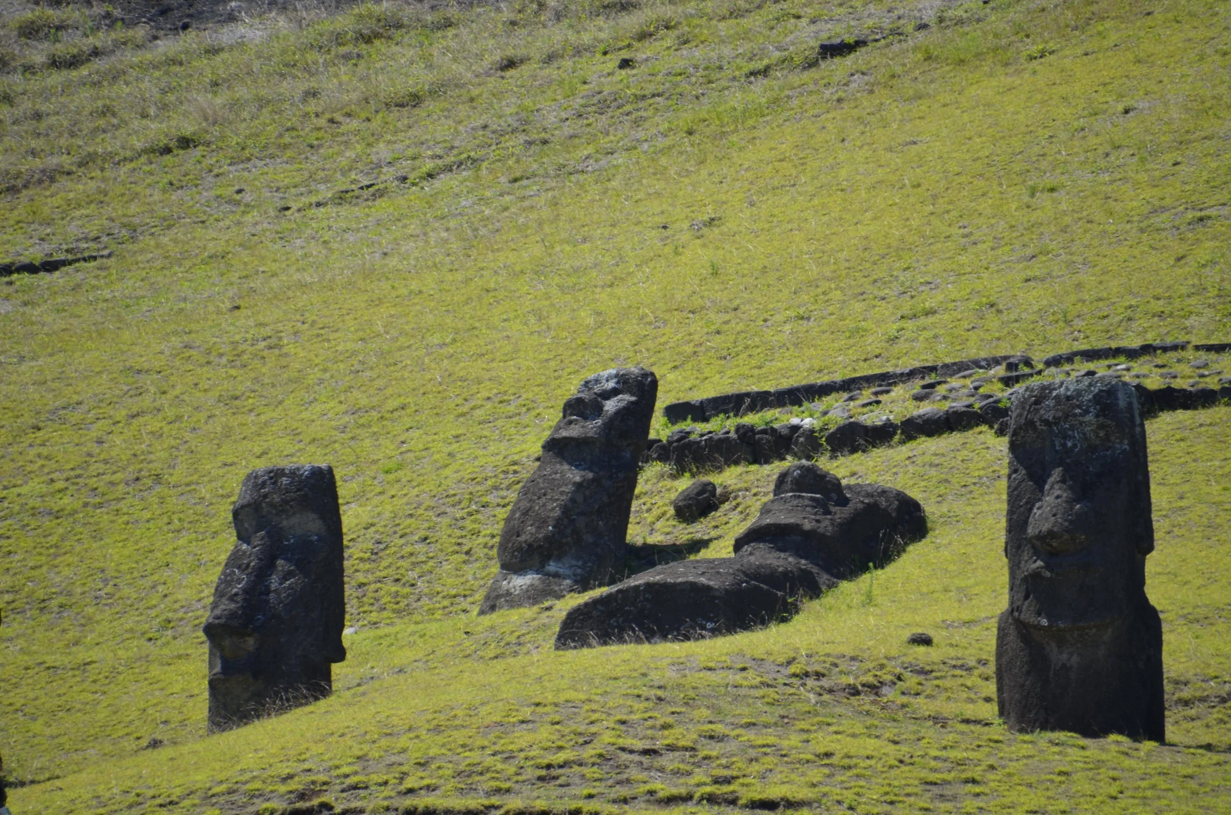 Nearby is the “quarry”, Rano Raraku, where nearly half of the ~1,000 moai on the island still reside.