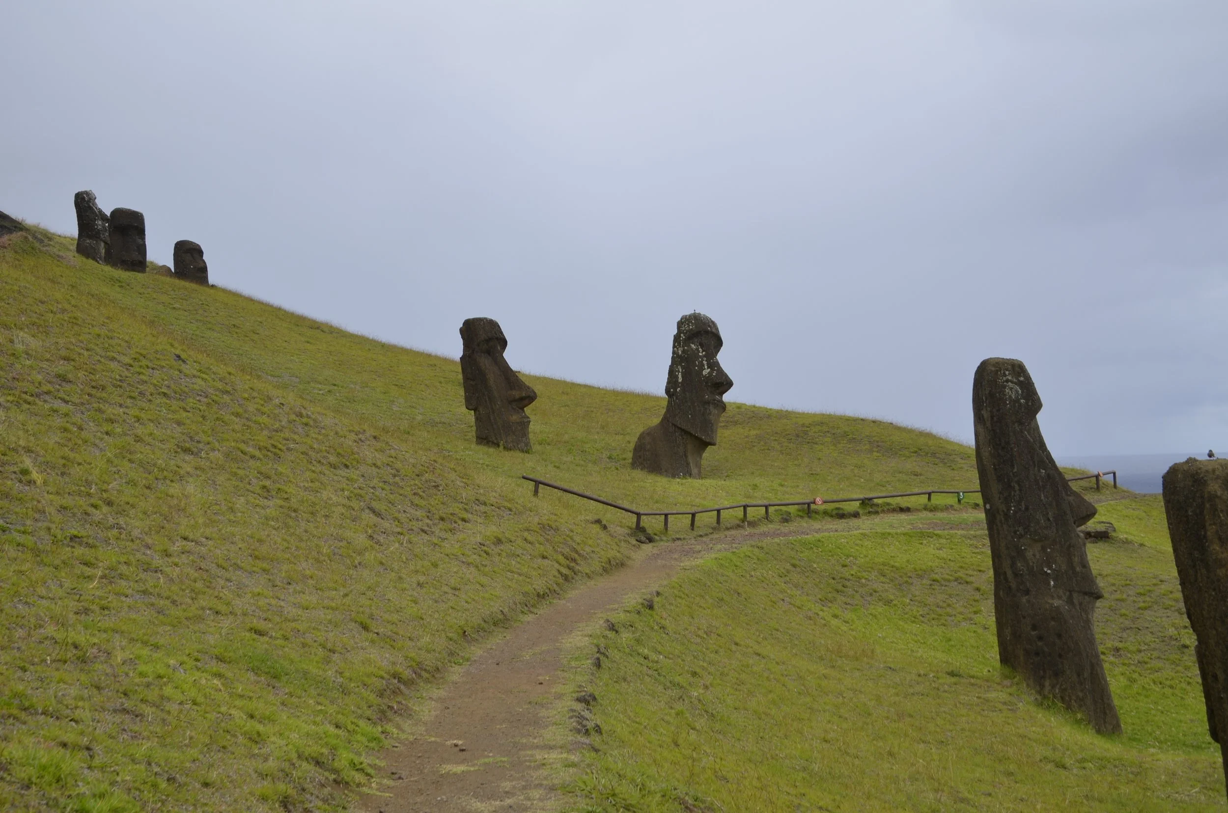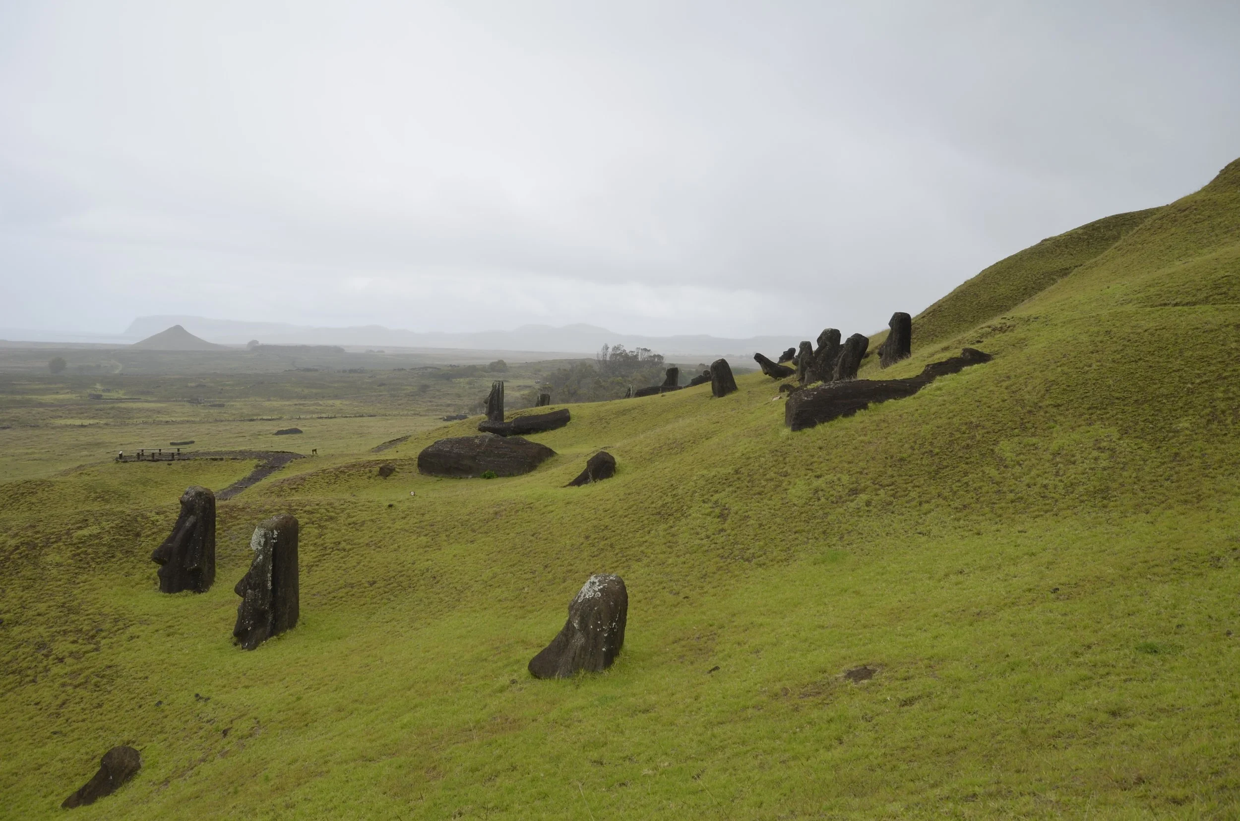 Now on to my absolute favorite site on the island - Rano Raraku, commonly referred to as “the quarry”. As we first started walking in there, it was cloudy and spitting rain…
