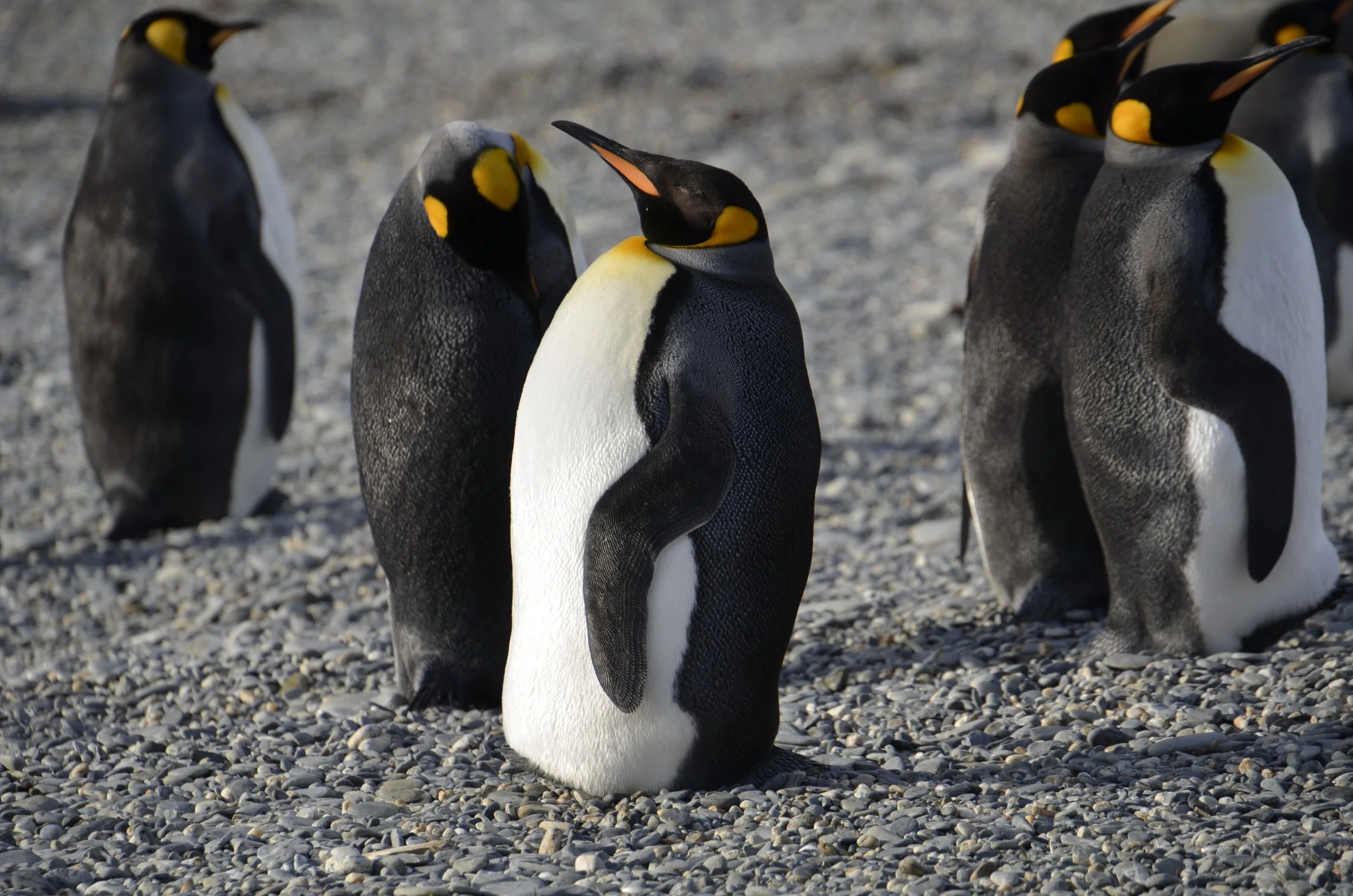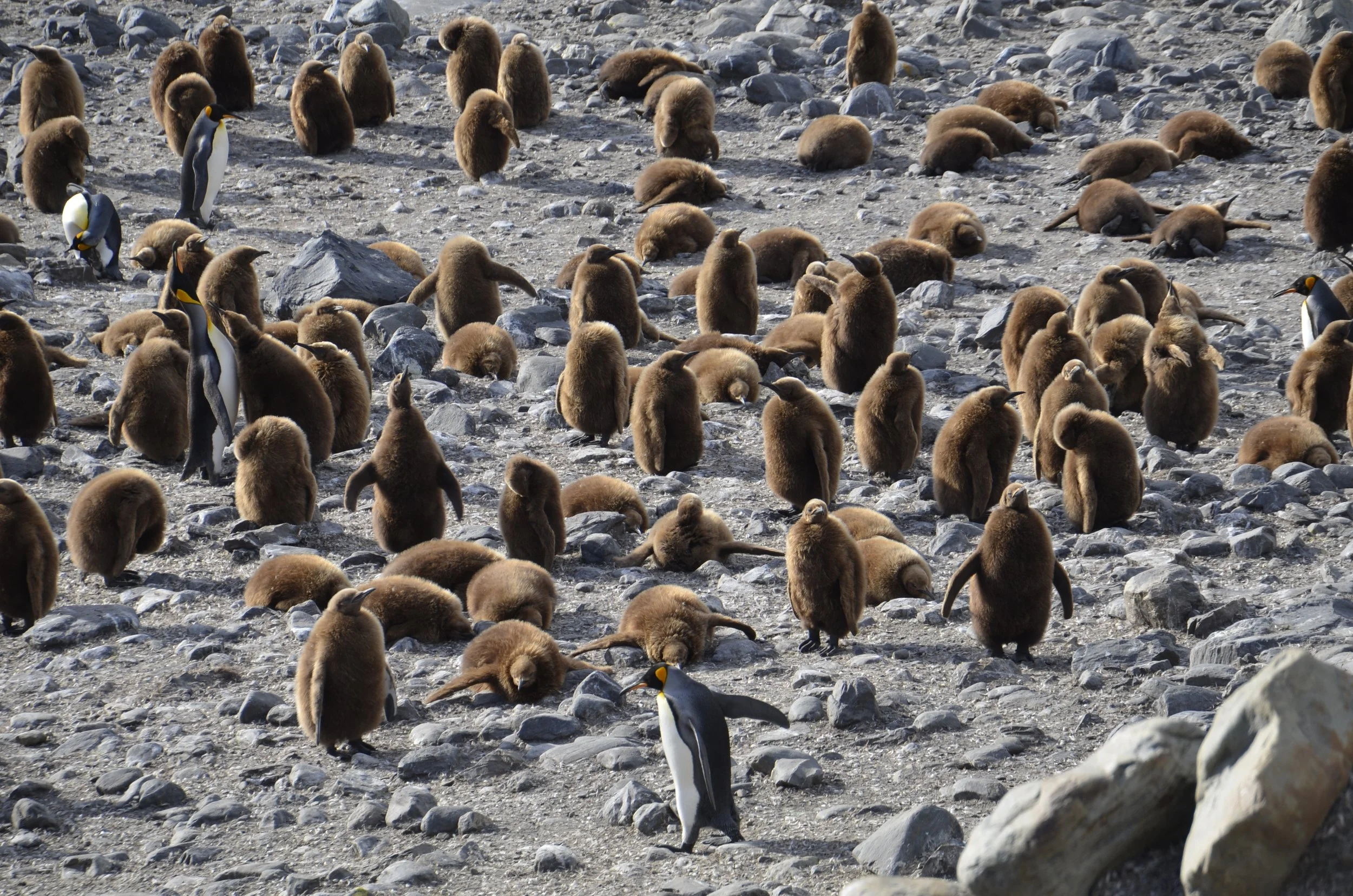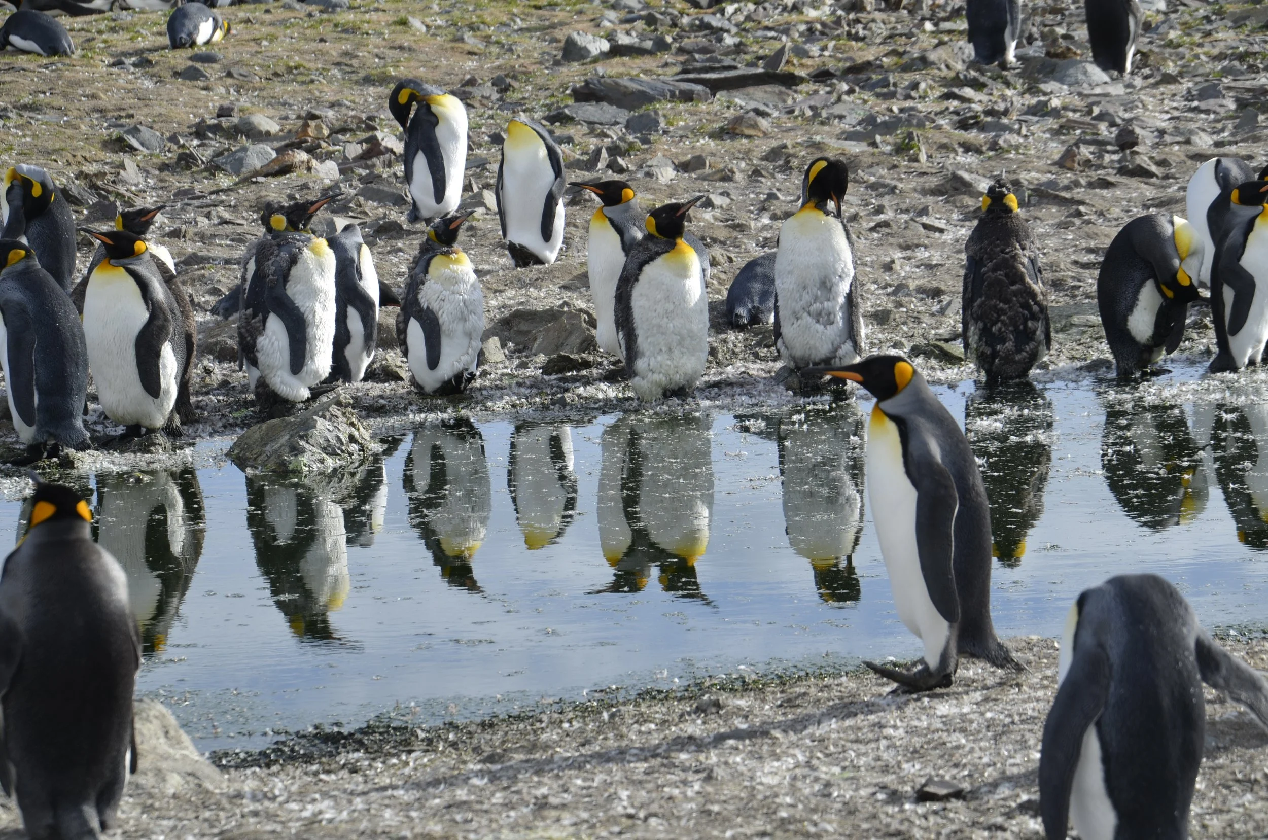 You can see the ground is covered with feathers, which the penguins have been shedding during their moult –