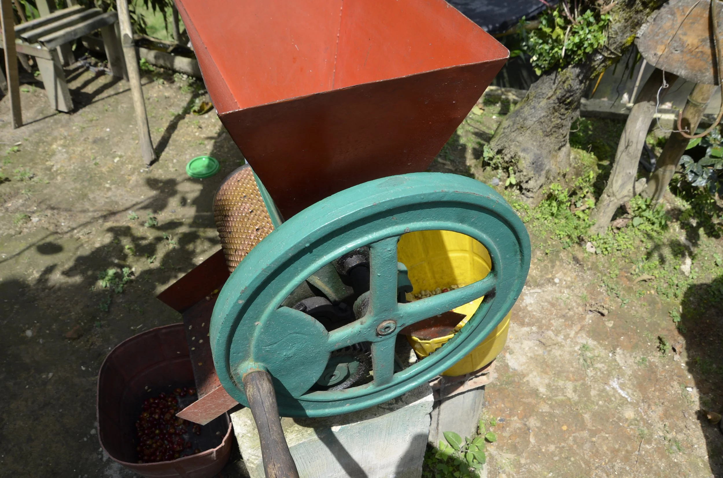 Once the red cherries are collected, they are brought to this “huller” that removes the red skins from the actual bean inside, neatly separating them into separate buckets -