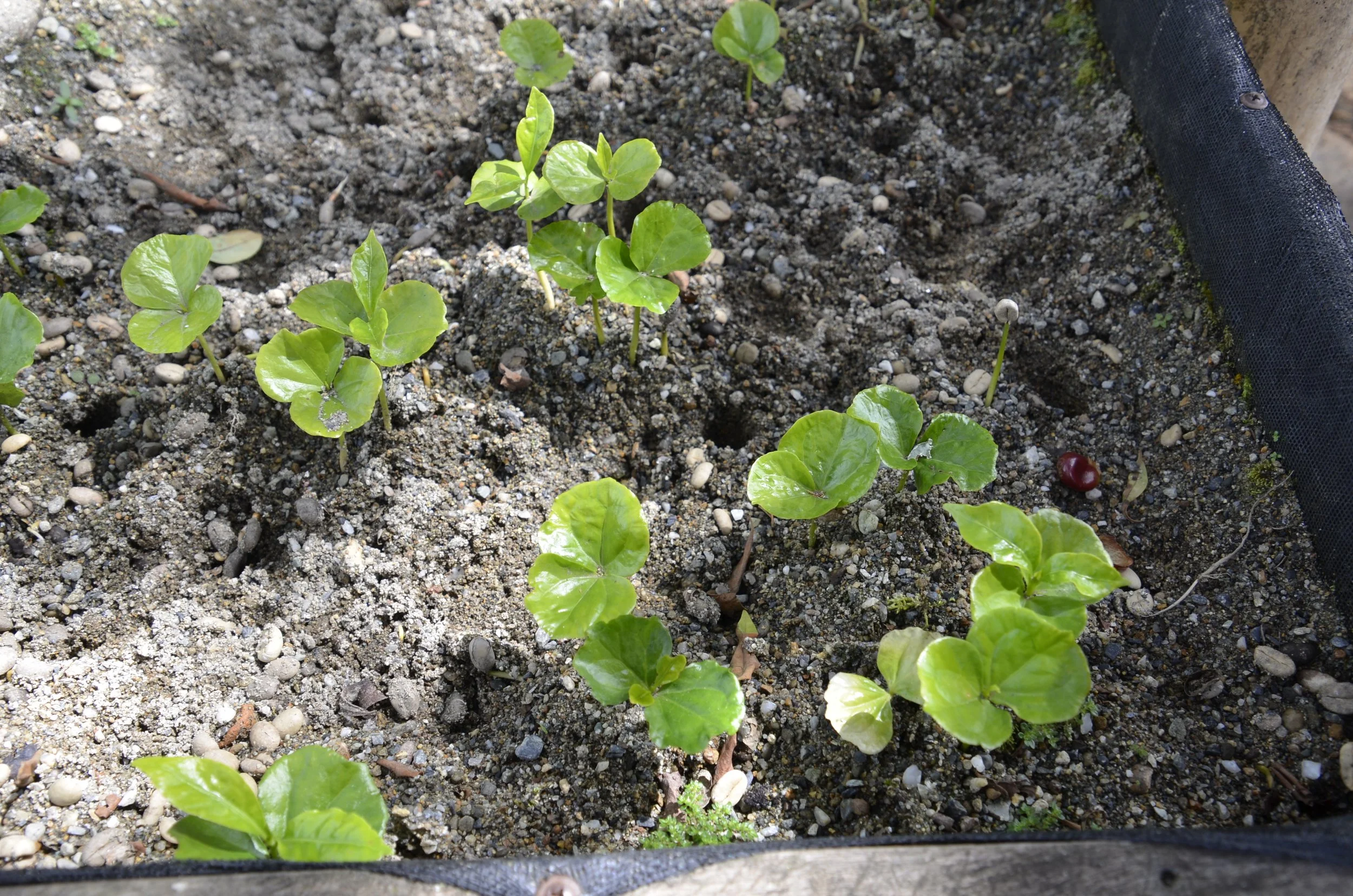 The red bean on the right is a ripe coffee “cherry”. It is placed in a hole in sandy soil…