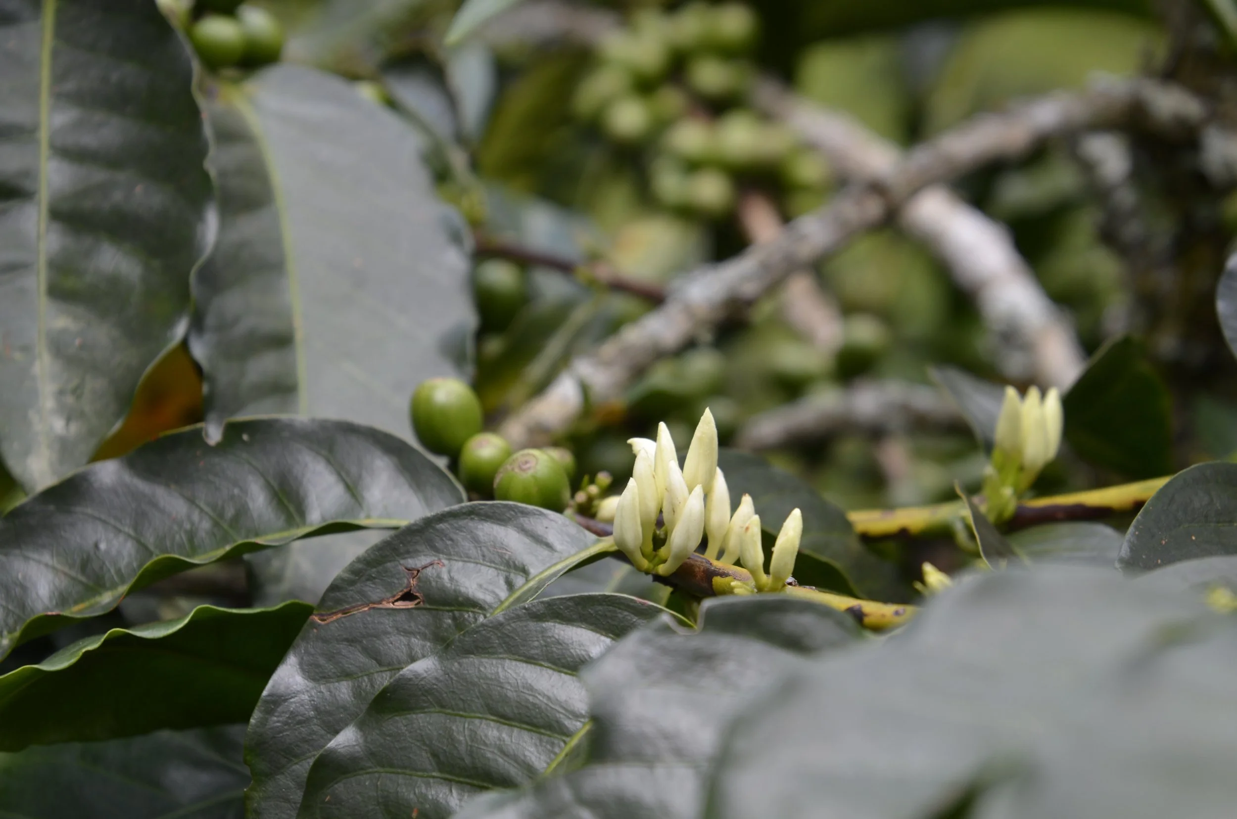 Can you see the man on the hillside? He’s picking some of the early ripening beans. With him on the hillside, you can use him for scale (and this is “just” a small family farm). The majority of the coffee ripens in April and May. The beans start from these flowers -