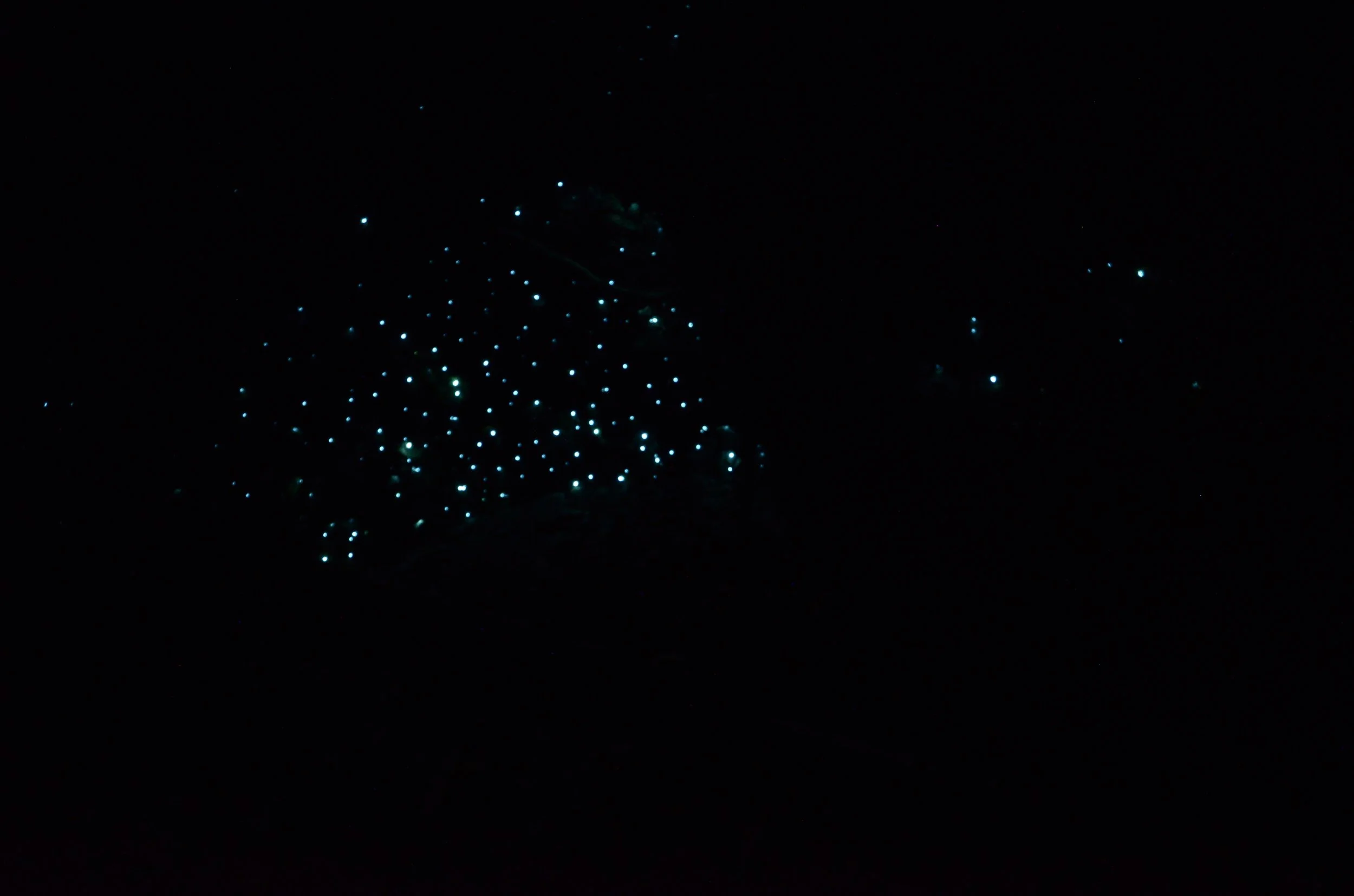 Glow-worms are the larvae of the fungus gnat. They have a glowing light on their tails that attracts prey. Glow-worms do not fly, like lightning bugs, but rather hang around waiting for little insects to come to them. On our first night in town, we followed Google Maps to walk to the dell, just about 5 minutes from our cottage. I took the tripod so I could get a prolonged exposure -