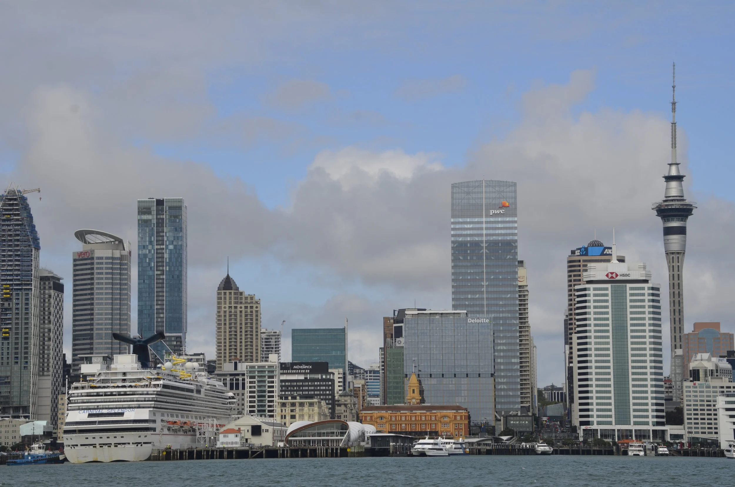 I realized when I was reviewing pictures for this post that we enjoyed various manifestations of water on the day we left Waiheke Island. On the ferry coming back to Auckland, we had this view of the city -