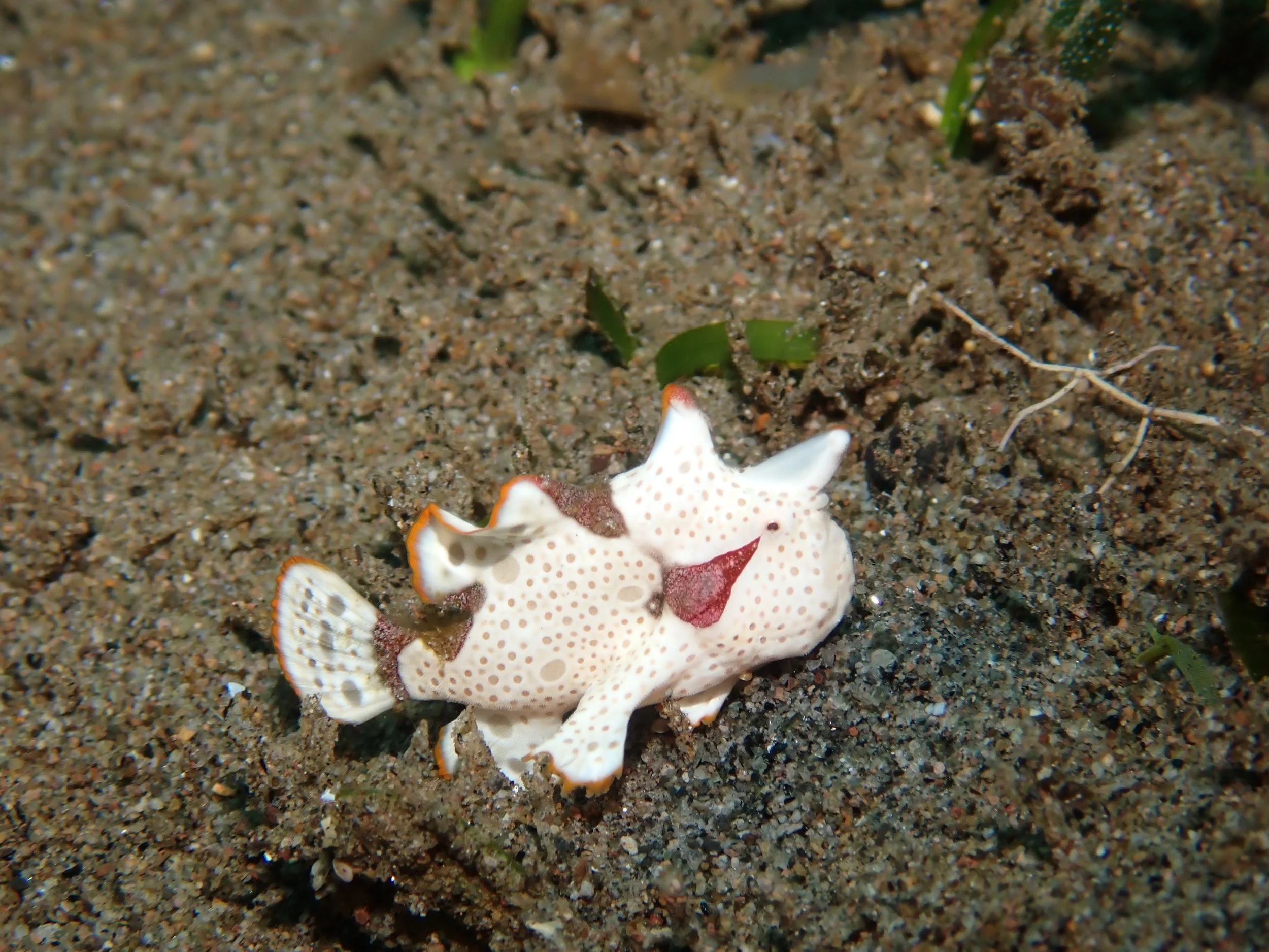 The dive boats left from the rocky beach, where you see the large outrigger in the photo above. We did 2 morning dives each of the 10 days of our stay, and even though we totaled over 50 dives for the entire trip, we still saw new critters or fish on every dive! I had shown you a frogfish on a previous post, but it was amazing how abundant they were here…