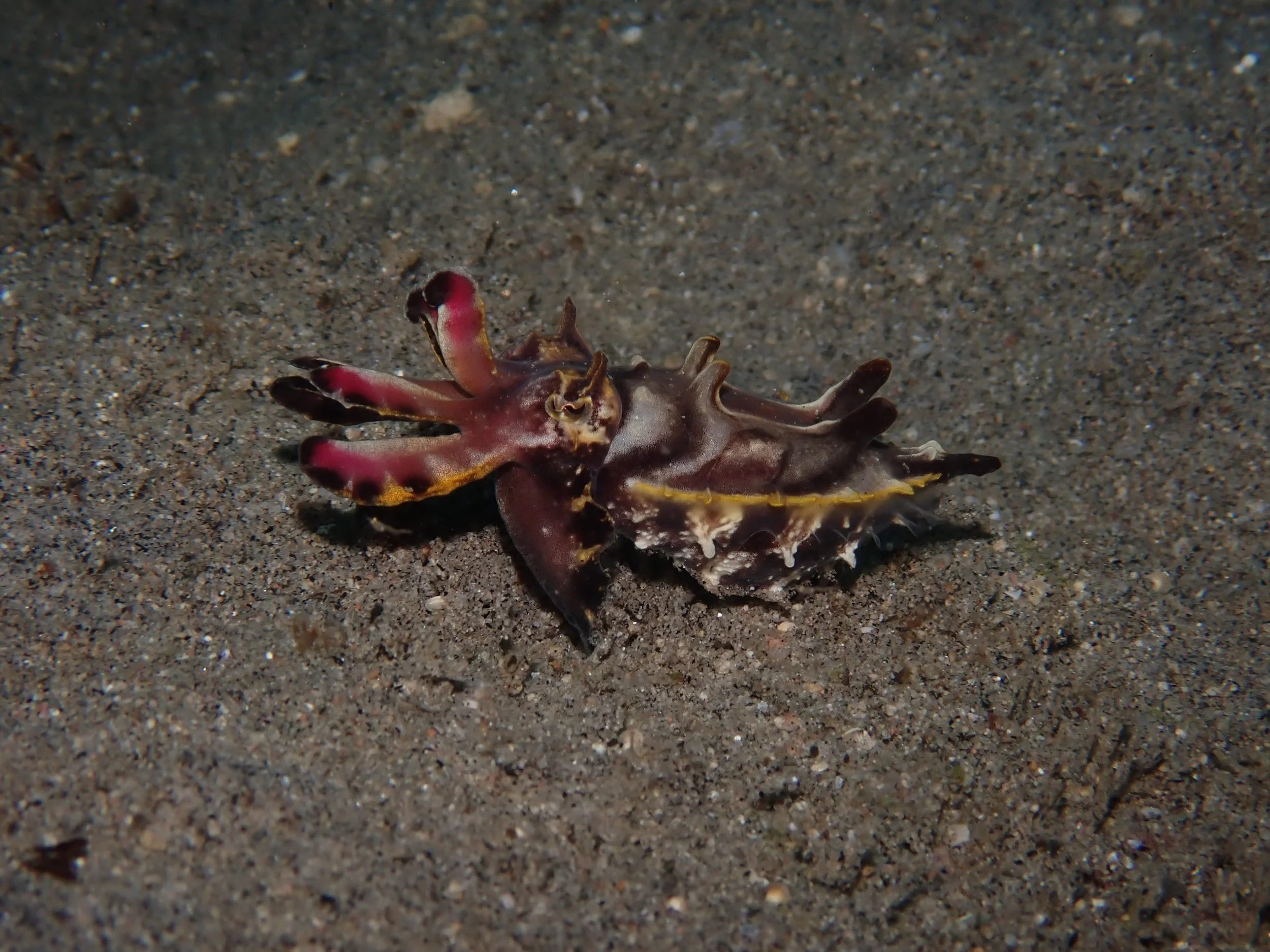 Did you see the dark bands passing repeatedly down its “forehead”? (Those were not shadows from the water surface above.) My absolute favorite of this family were the Flamboyant Cuttlefish…